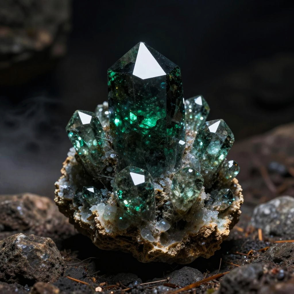 Malachite crystal cluster emerging from rocky cave, sparkling facets catching ambient light, dark green hues with layered tones, photorealistic rendering, textured rock surface, atmospheric mist, moody and mysterious environment