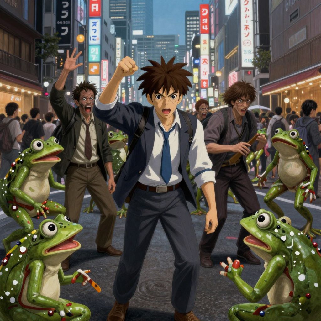 A vivid digital illustration depicts a chaotic urban street scene at dusk. At the center, a spiky-haired young man in a white shirt, blue tie, and dark suit stands triumphantly with a fist raised, surrounded by green frogs holding candy canes. Two men in disheveled dark suits and glasses, with wild expressions, loom in the background. Bright neon signs in Japanese characters illuminate the surrounding buildings, adding a vibrant, bustling city atmosphere. The street is crowded with people, and the overall style is dynamic and exaggerated, reminiscent of anime.