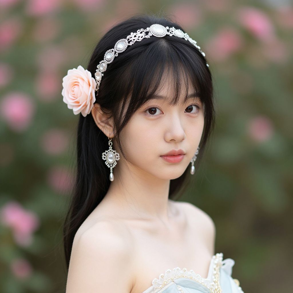 Wirt costume, 1girl, solo, realistic, flower, blurry background, hair ornament, jewelry, hair flower, earrings, blurry, looking at viewer, black hair, dress, hairband
