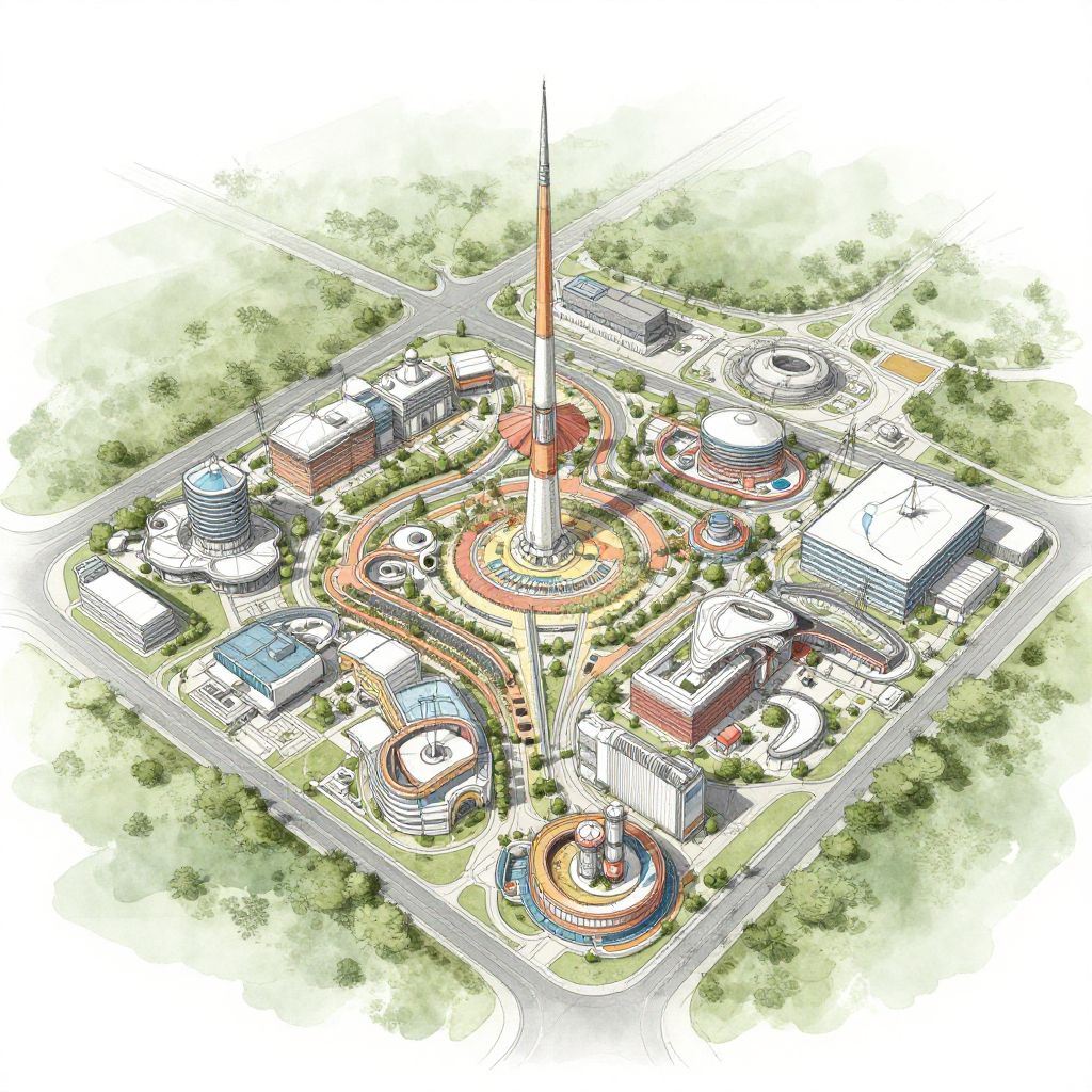 This is a colorful, detailed, digital architectural illustration of a city block featuring a central tall, orange spire surrounded by various buildings and roads. The spire is surrounded by circular walkways and landscaped areas with trees. Buildings include a mix of modern, cylindrical, and rectangular structures, with varied rooftops and colors. Roads create a grid-like pattern around the block. The image is viewed from an aerial perspective, highlighting the central spire and the interconnected design of the surrounding structures and green spaces.