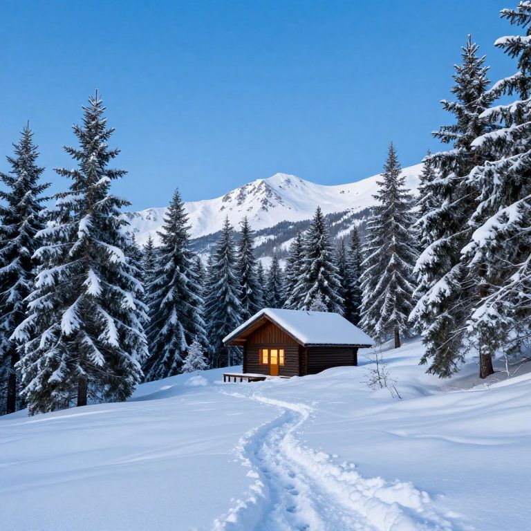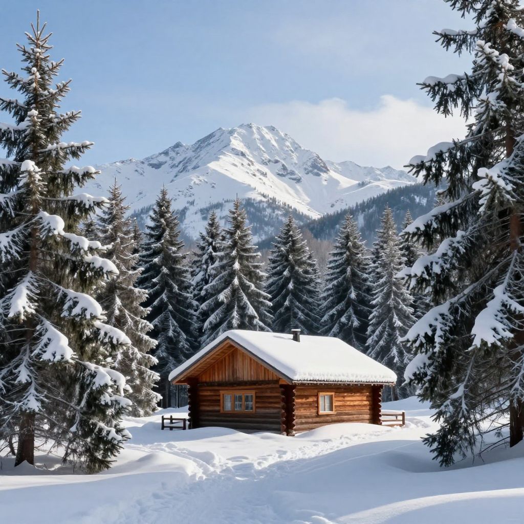 Beautiful winter mountain scene covered in fresh snow, crisp clear blue sky overhead, pine trees blanketed with snowflakes, a small cozy cabin emitting warm light, footprints leading from the door, serene and quiet ambiance, ultra-realistic and detailed landscape.