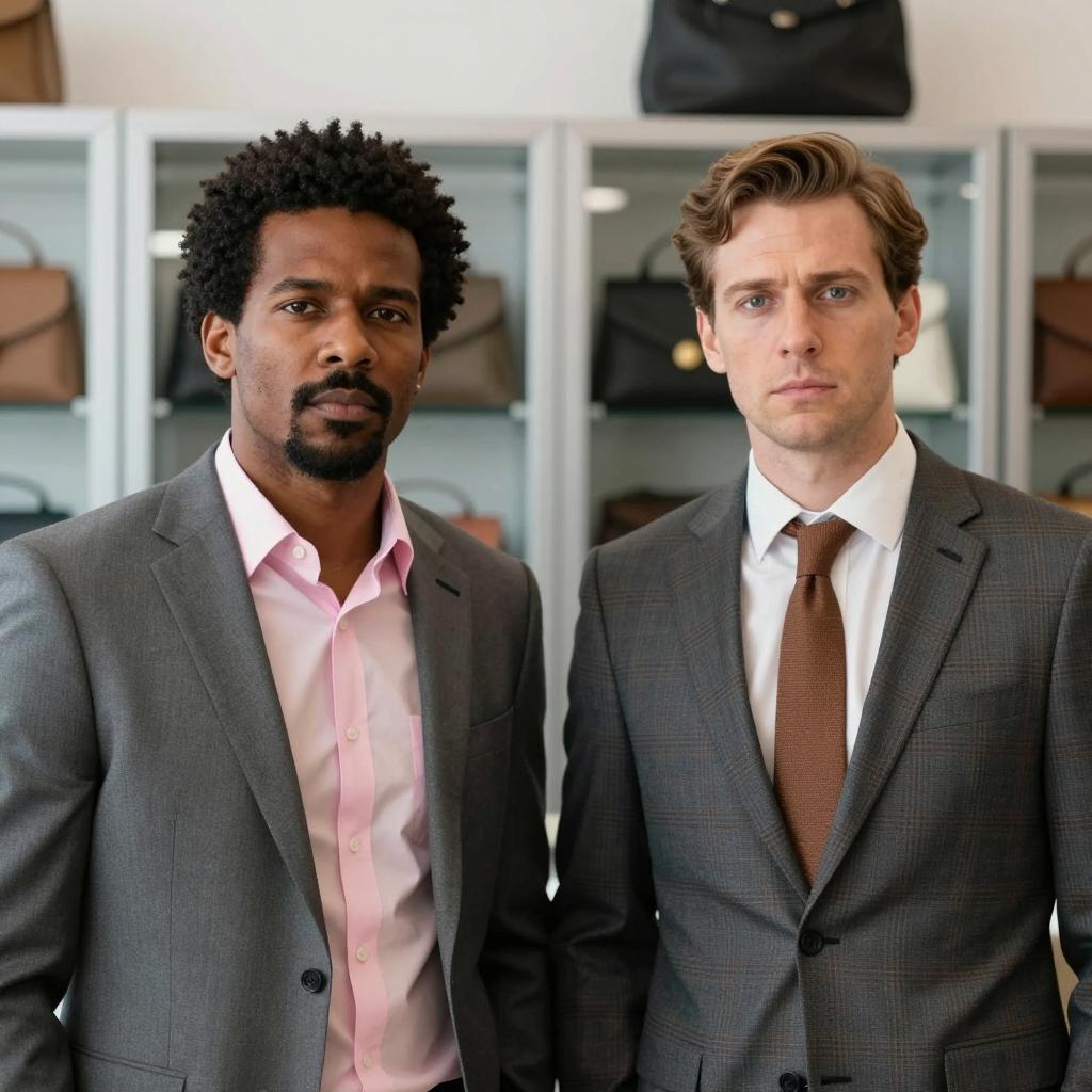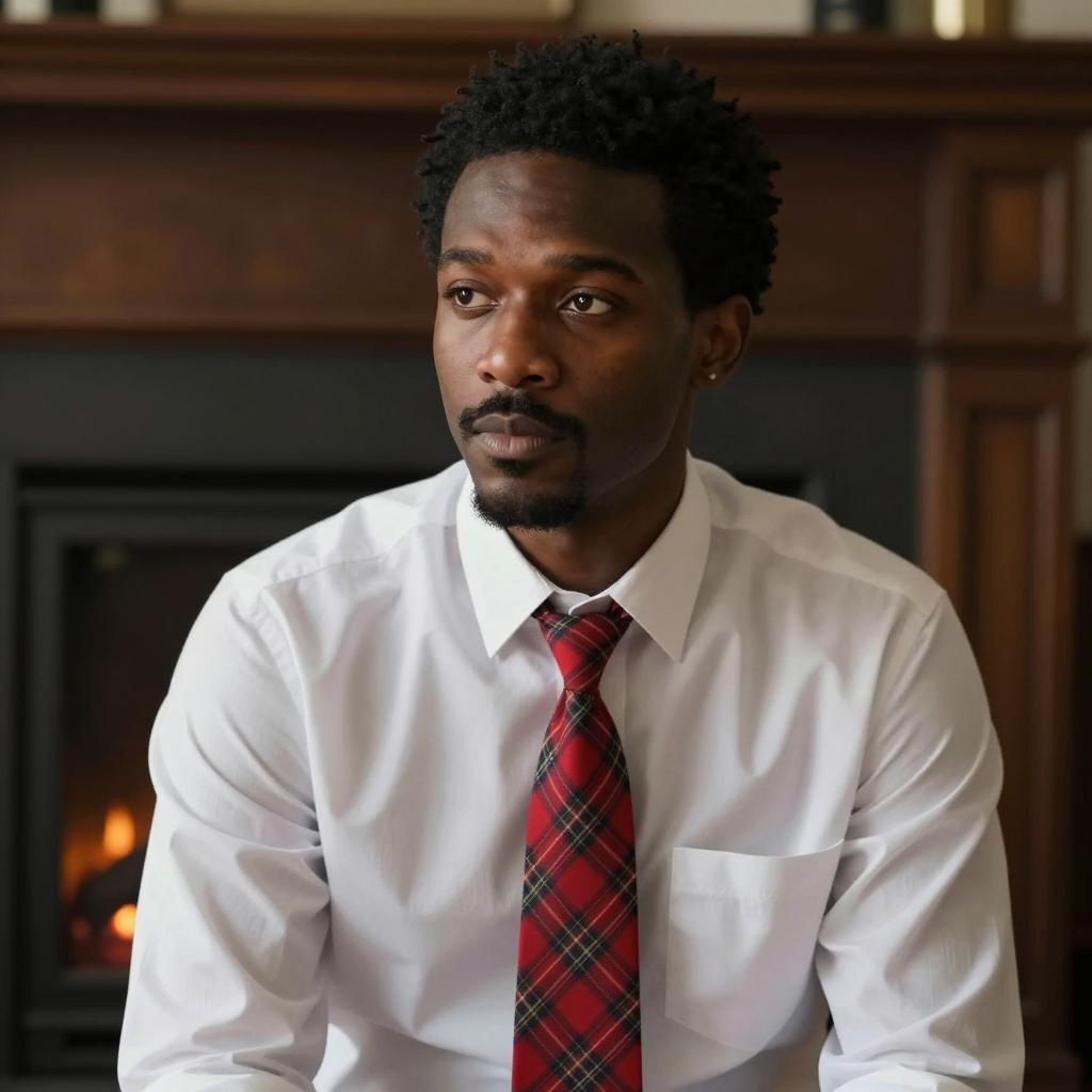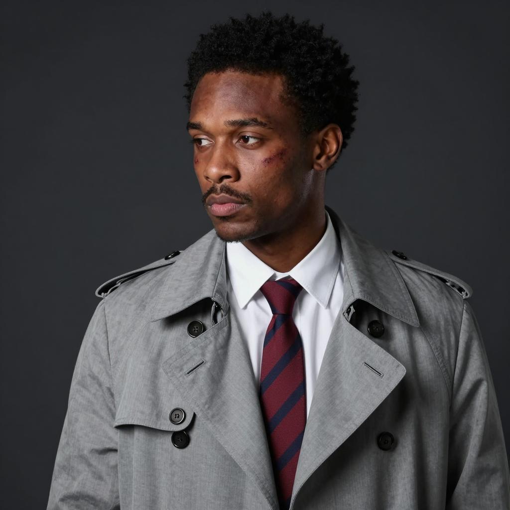 A medium-skinned Black man with short curly hair and a thin mustache, wearing a light gray trench coat over a white shirt and red-striped tie, looking to the left with a serious expression. Dark background. Face slightly illuminated, body in shadow. One visible bruise on left cheek. Man's head turned slightly downward.