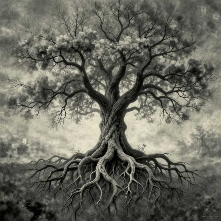A single tree roots itself through multiple dimensions, its branches extending into dreamscapes, abstract mathematics, and forgotten mythologies.