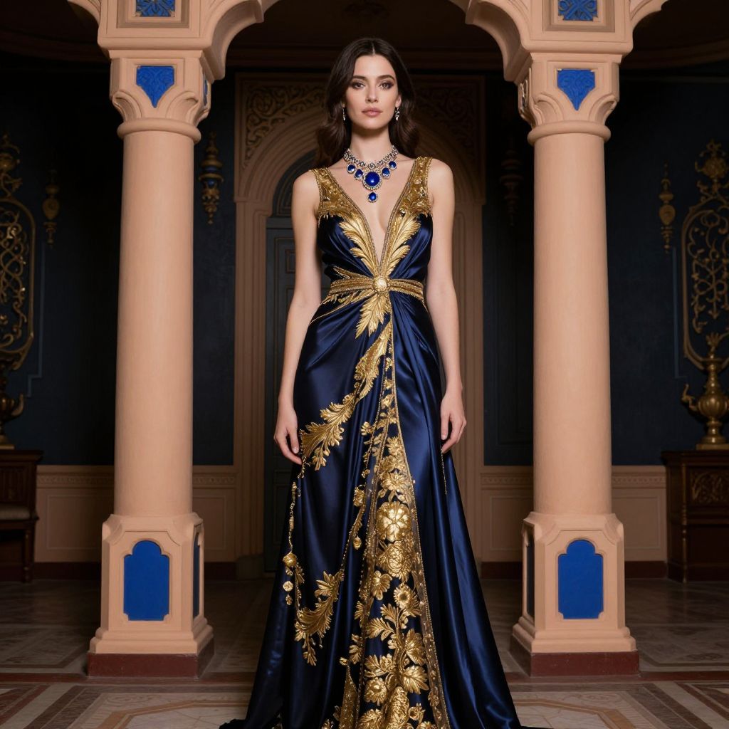 Photograph of a slender woman with medium-length dark brown hair standing in an opulent, archway-adorned room. She wears a floor-length, navy blue satin gown with intricate gold floral embroidery along the bodice and skirt. Her outfit is complemented by a bold, dark blue necklace with matching earrings. The room features ornate, pale peach columns with blue accents and rich, dark blue walls. The floor has a polished, marbled pattern, adding to the luxurious setting. The woman's confident, poised stance and the elegant, classical architecture create a striking visual contrast.
