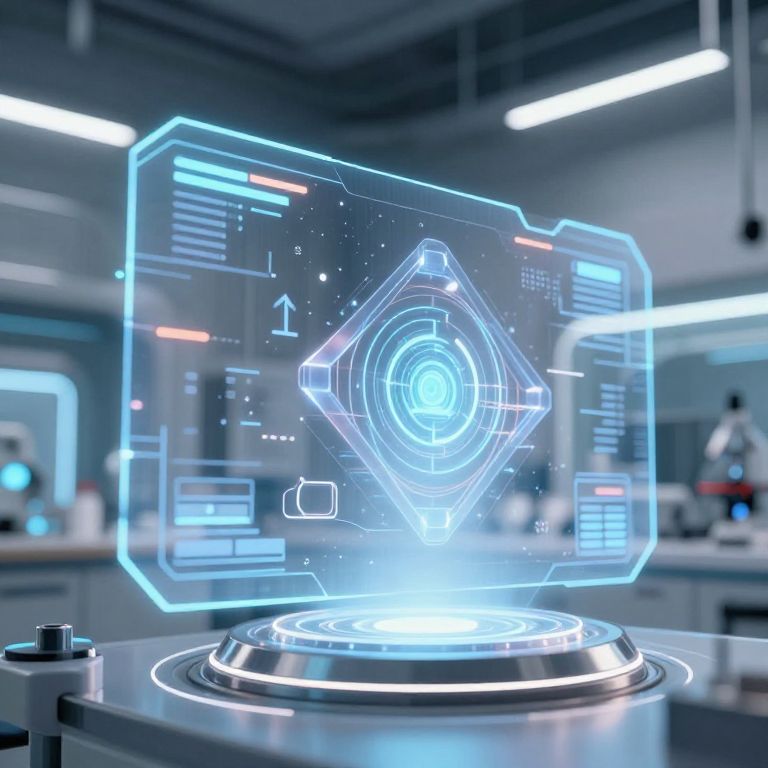 CGI image of a futuristic, glowing holographic interface with blue neon lines, centered on a metallic circular platform in a high-tech laboratory.