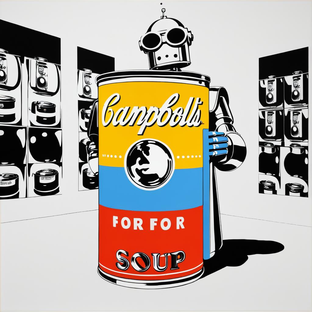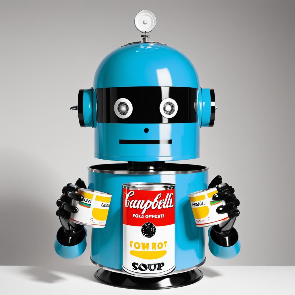Robot by Andy Warhol holding a can of soup, creative and surreal composition.
