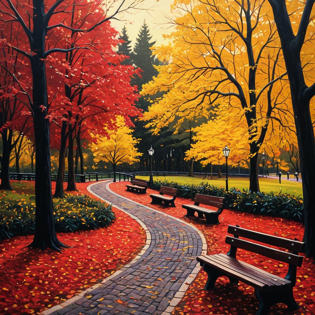 An enchanting autumn park, featuring crimson and gold leaves, wooden benches, and winding pathways, painted with warm late afternoon lighting, illustrated in rich textured acrylic painting