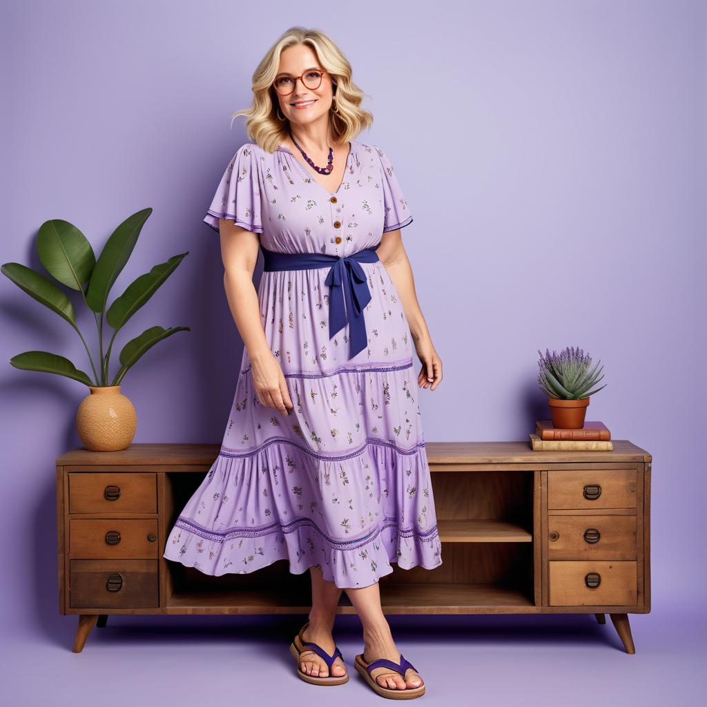 Photo-shoot, laid-back middle-aged woman, shoulder-length blonde waves, curvy figure, librarian outfit, maxi dress and flip flops, bohemian style. Lavender haze studio background