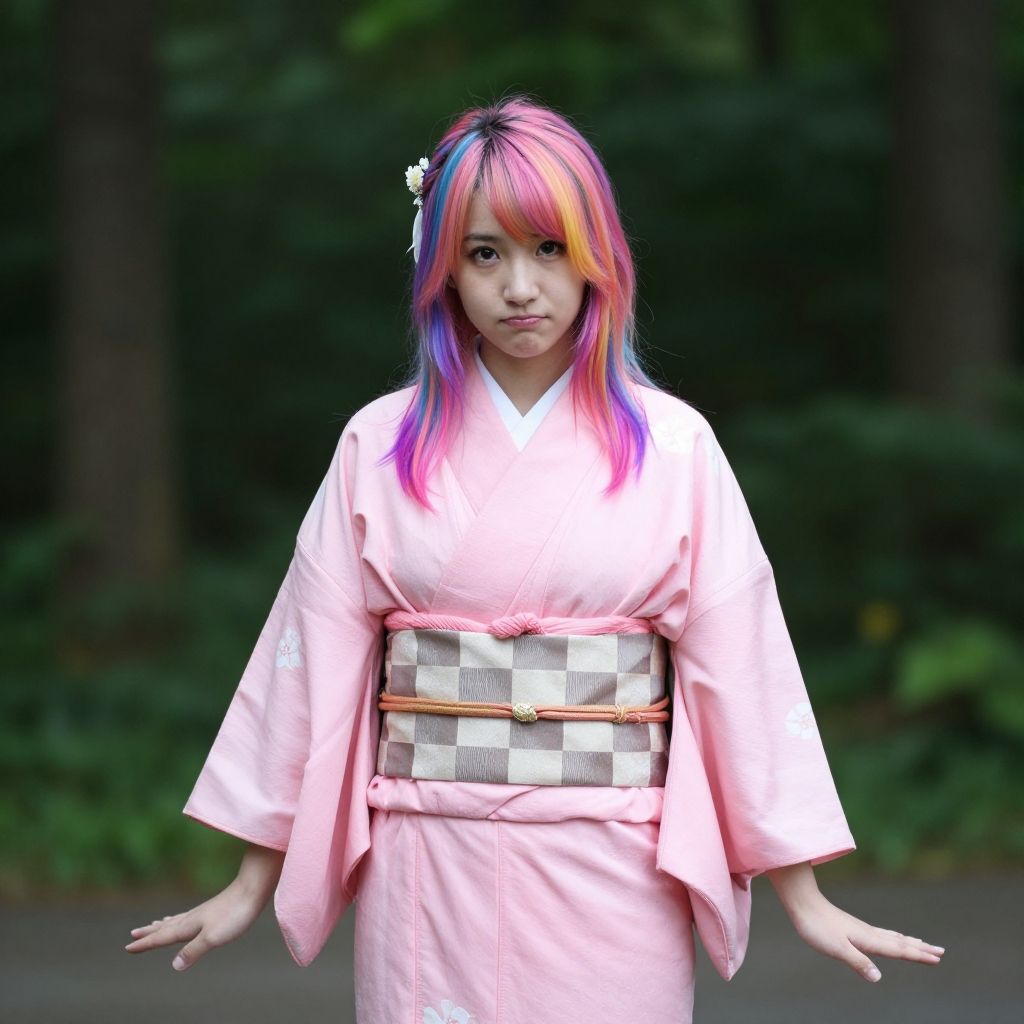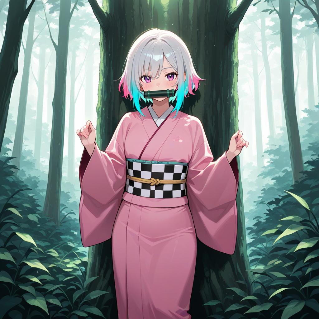 Masterpiece, best quality, 1girl, multicolored hair, pink kimono, bit gag, checkered sash, looking at viewer, standing, in forest, perfect light, hands away