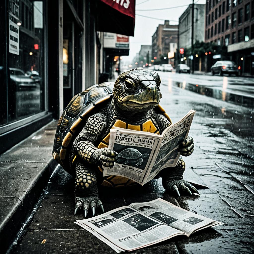 Lowbrow art of a hippopotamus reading a newspaper, influenced by Marcel Dzama, in a nostalgic, foggy morning in the city, gritty textures, dramatic lighting, urban and melancholic