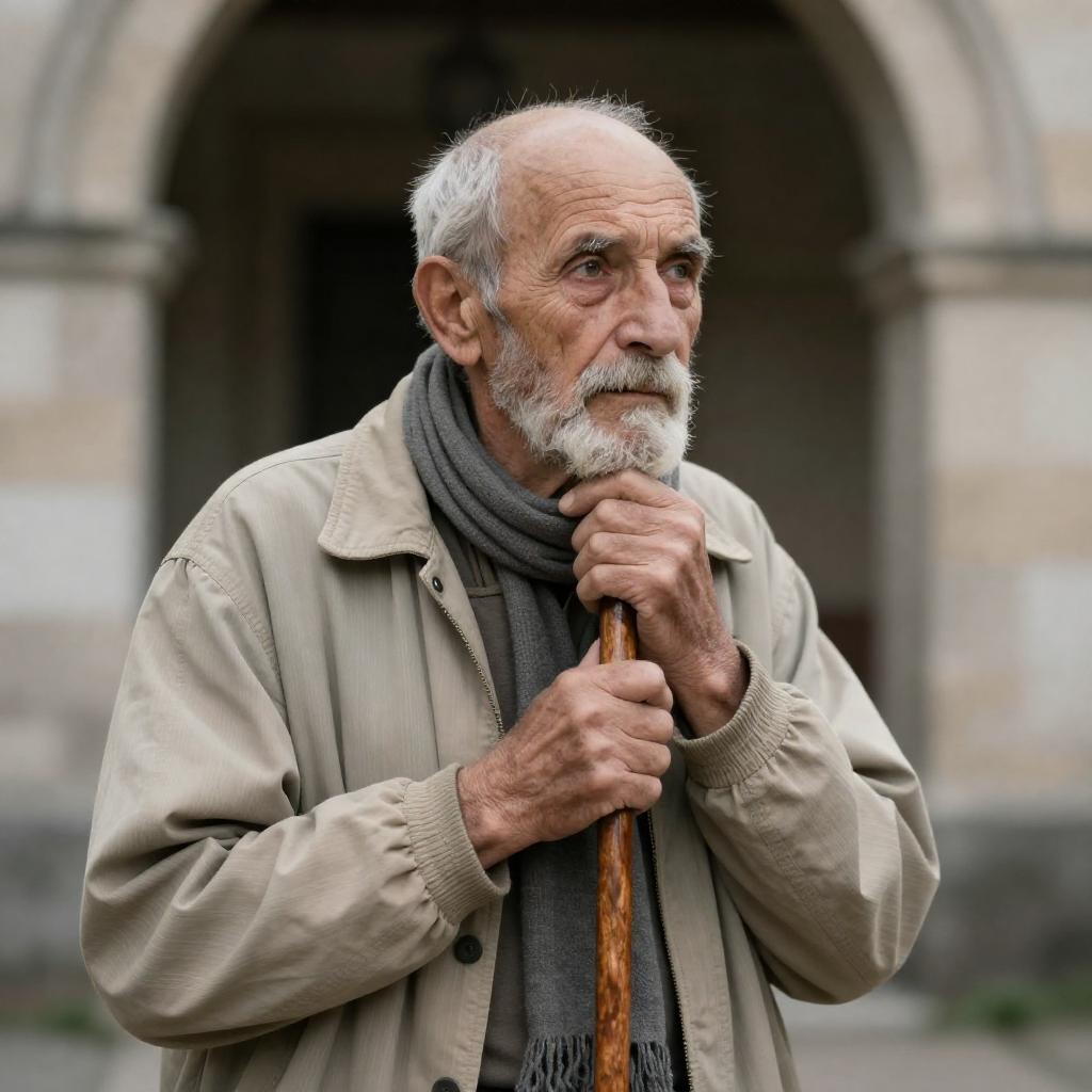 Close-up photograph of an elderly man with a weathered face, wearing a gray flat cap and dark overcoat. He has a pipe in his mouth and deep wrinkles, with a serious expression. The background is blurred, suggesting an outdoor setting. The lighting highlights his facial features and ure.