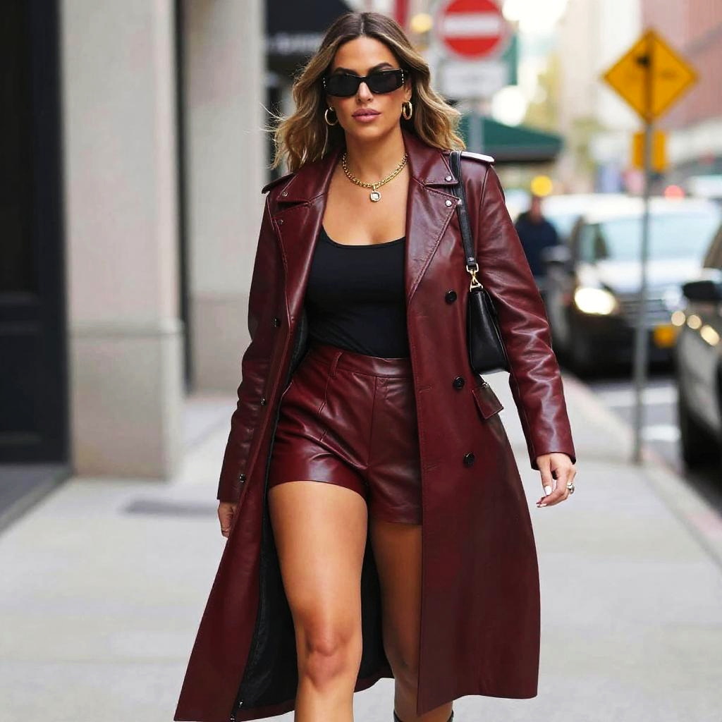 Ashley Graham leather outfit, dynamic fashion portrait with leather coat and accessories, vibrant colors, city street scene, bold and contemporary style, sharp focus
