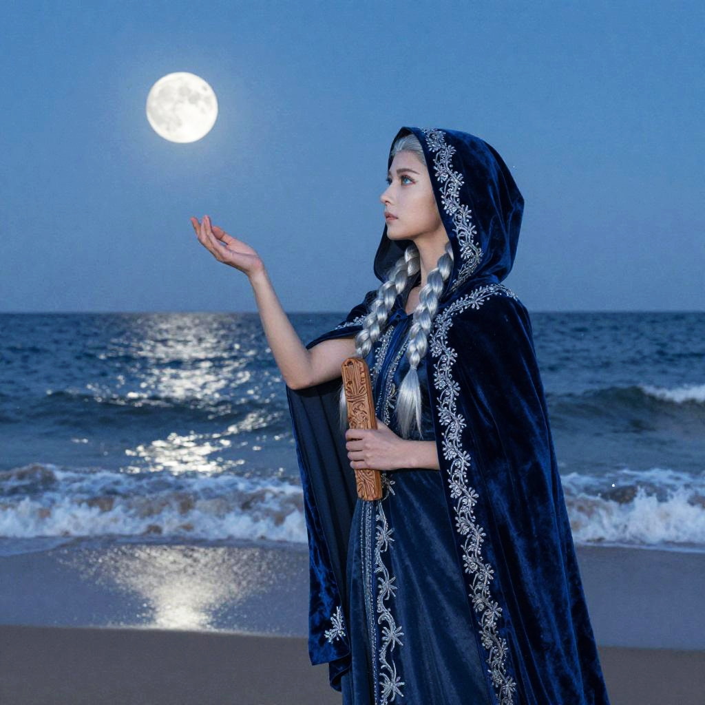 Wide shot, 1person, solo, stately presence with pale sapphire eyes beneath a hood of silvery braids, wearing a ornate deep blue velvet cloak with silver embroidery, standing on a moonlit beach, lifting a hand as if inviting a gentle wave, gripping a carved wooden talisman of the sea, starry sky, full moon, tranquil ocean waves, watercolor painting style, blue background