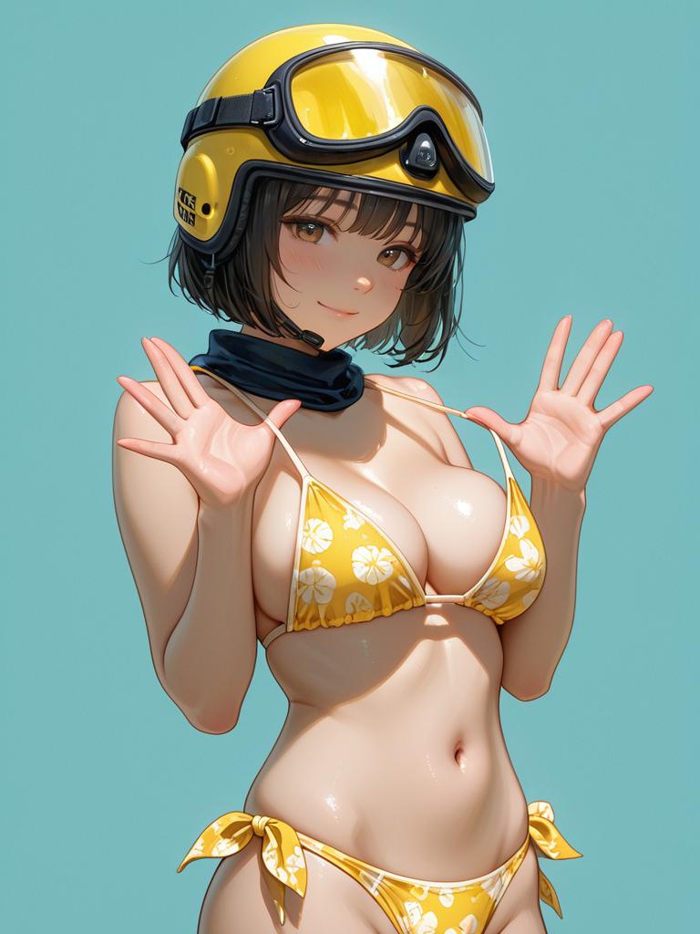 1girl, realistic face, Tropical print bikini, triangle top, cheeky cut bottom, smooth polyester blend, deep blue background, bold yellow pineapples, delicate ruffle trim, removable padding, fully lined, UV protection, comfortable fit.