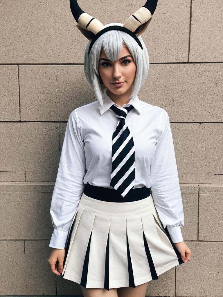 Photo-realistic cosplay photo of person in arabian oryx (kemono friends) costume. 1girl, gazelle ears, gazelle tail, tail, extra ears, gazelle horns, brown eyes, hair between eyes, white hair, short hair, two-tone hair, antenna hair, brown hair, black hair, pleated skirt, white skirt, white shirt, collared shirt, striped necktie, short over long sleeves. full body shot