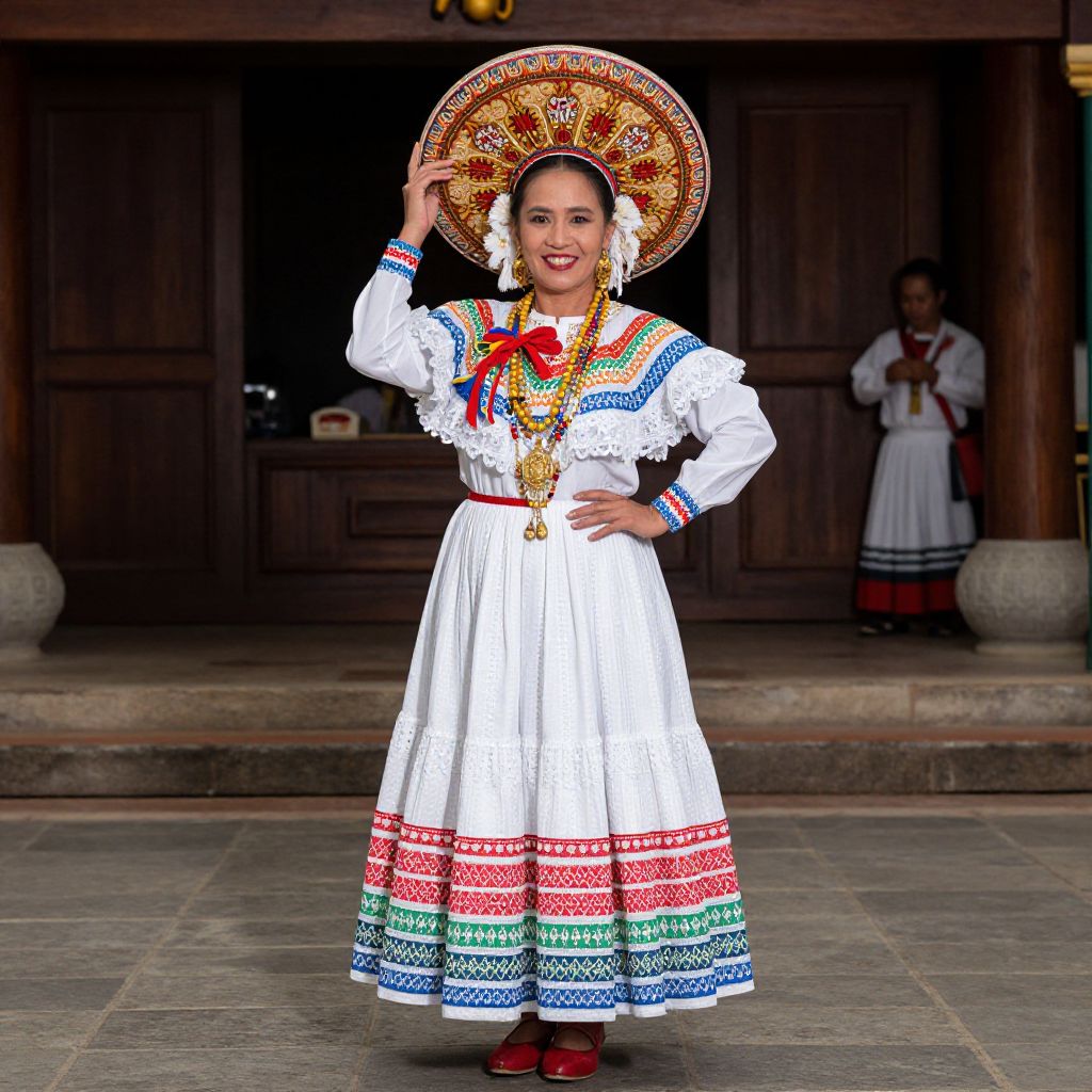 Pangalay Folk Dance Costume, woman in traditional dress standing with a large hat