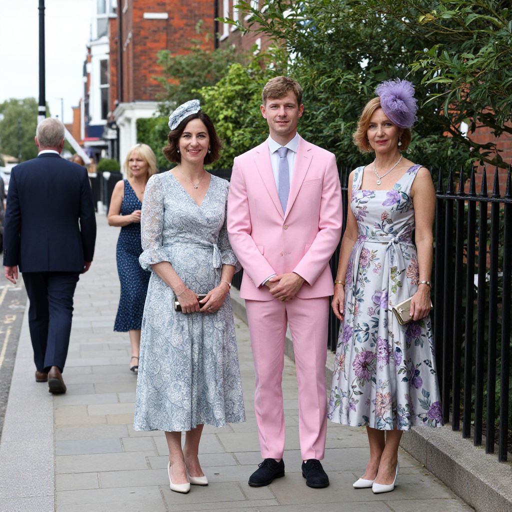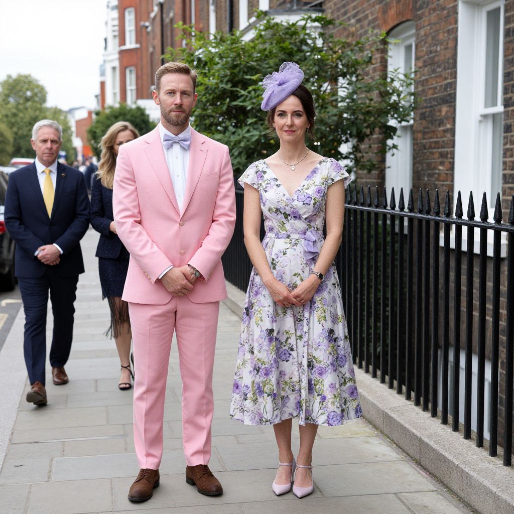 Elegantly dressed figures stand on Arklow Street in Deptford, with a man in a vibrant pink suit and a woman in a floral dress adorned with a lilac headpiece, while pedestrians in formal attire walk along the sidewalk lined with brick buildings and greenery.