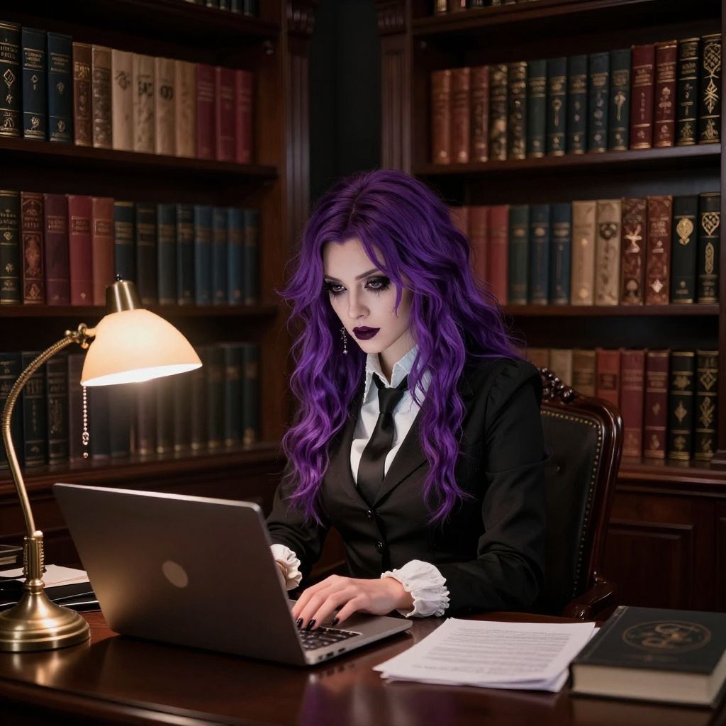 Goth secretary with purple hair and dark lipstick, surrounded by dark wood shelves full of occult books, working on a laptop under a flickering desk lamp in a gothic office