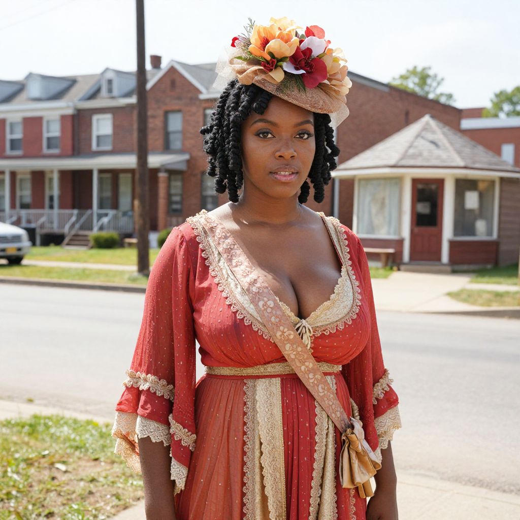 African American vintage costume worn by a young woman with deep brown skin, curly black hair styled in braids, and warm brown eyes, standing in a sunny 1940s African American neighborhood with a row of brick houses and a small corner store in the background, the costume features a flowing red and gold dress with lace trim, a large floral hat, and a vintage sash, photographed in natural daylight with authentic period details.. The woman has big breasts and cute face
