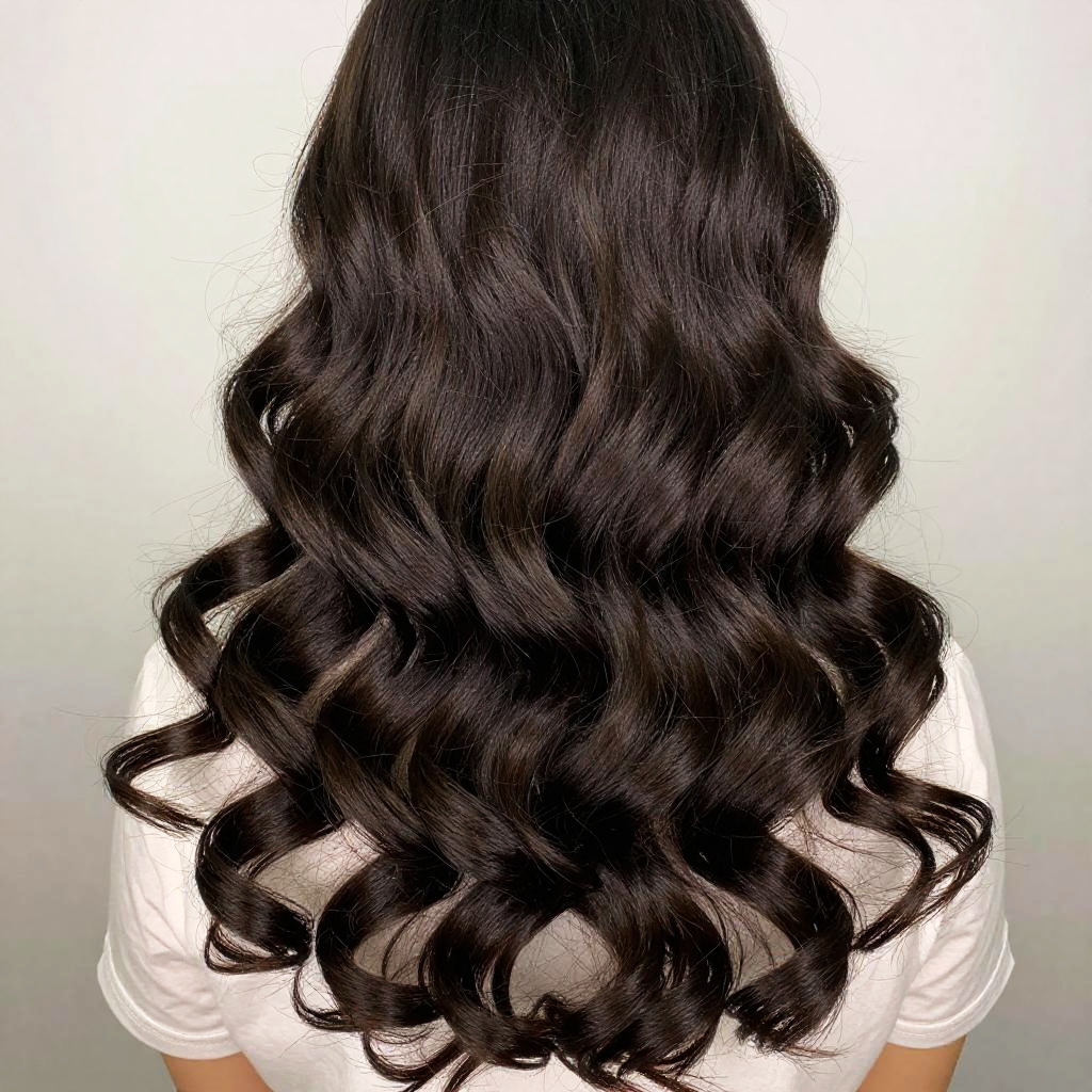 Long dark curly hair, close-up of long dark curly hair cascading over shoulders, intricate curls, shiny and healthy texture, studio background