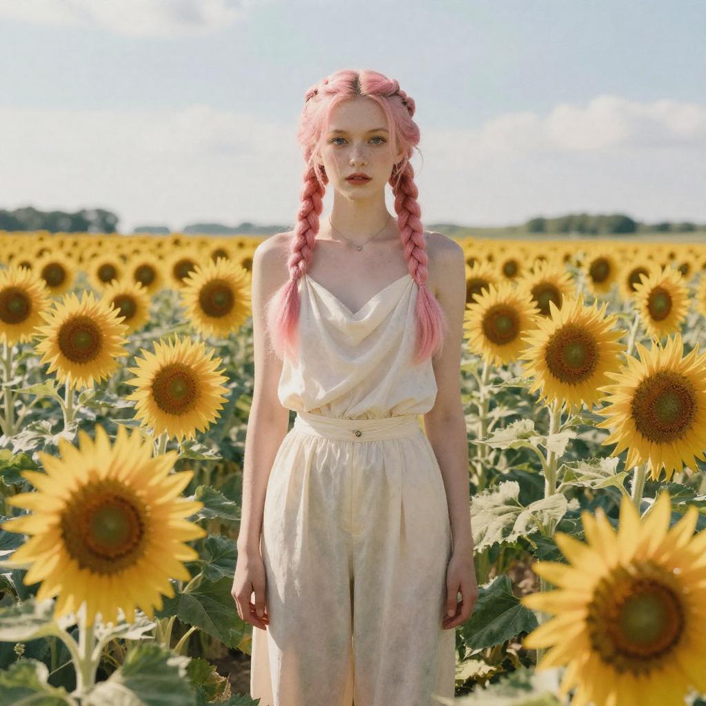 1girl, cinematic lighting, centered, (colorful), watercolor, high contrast, Draped top and wide-leg trousers, Dutch braids with baby pink highlights hairstyle, A tranquil, sunlit field of sunflowers, (masterpiece, top quality, best quality, official art, beautiful and aesthetic:1.3), extreme detailed, highest detailed, (ultra-detailed), ((an extremely delicate and beautiful))