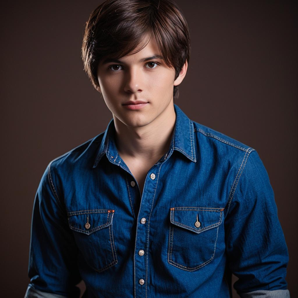 Portrait of a young man with short brown hair wearing a blue button-down shirt with rolled-up sleeves and dark jeans, posing against a solid brown background with soft lighting.