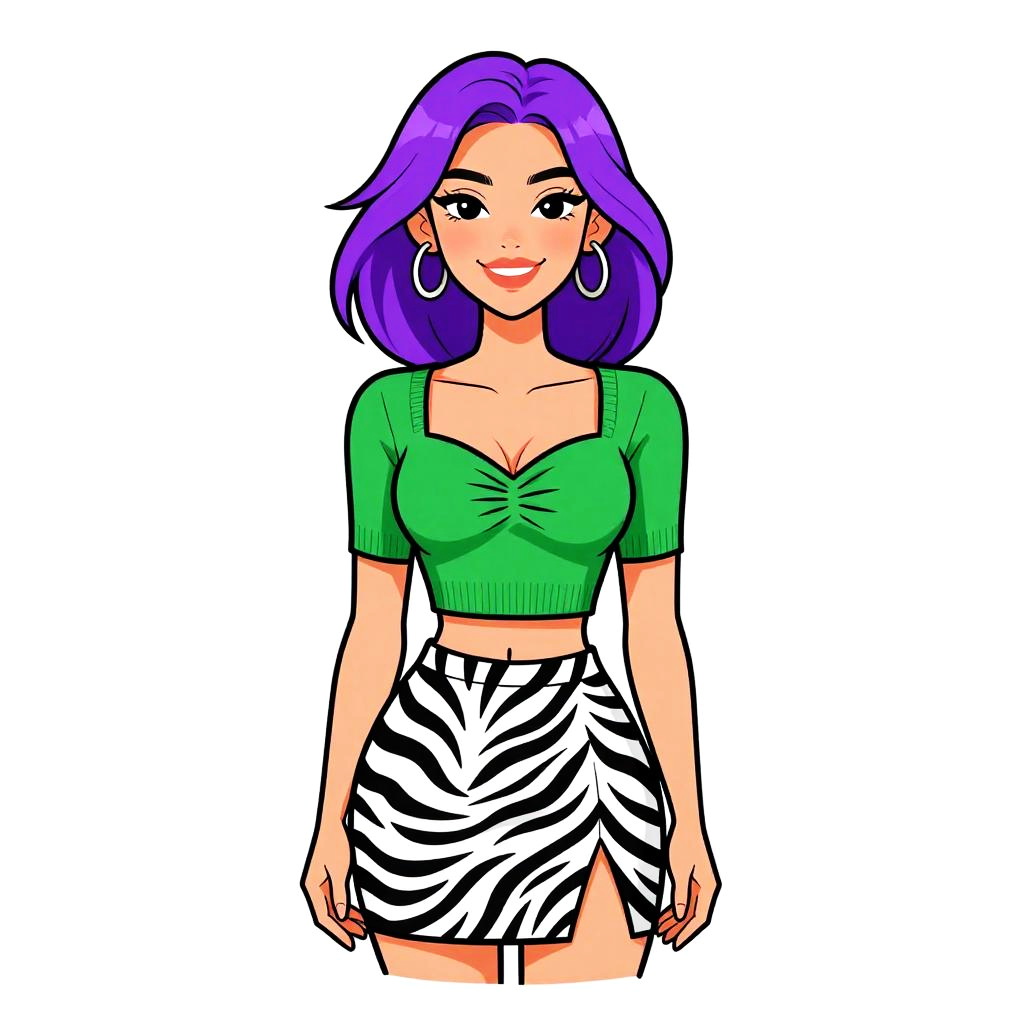 Woman with pretty face and pretty hair. smiling Woman, casual chic, fitted green cropped sweater with short sleeves and sweetheart neckline, center front ruching detail, black and white zebra print mini skirt with a slight slit, plain white background. --sref 1467