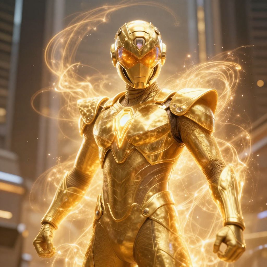 Powerful figure in a gold superhero costume, futuristic helmet with glowing visor, surrounded by mystical golden energy aura, sci-fi metropolis backdrop, cinematic perspective