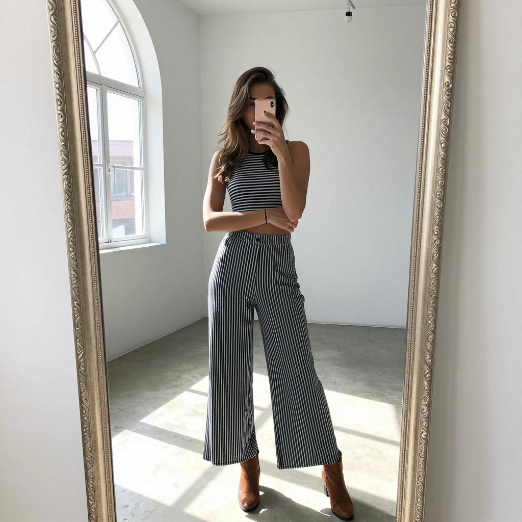 Woman with long brown hair, wearing a black and white striped crop top and wide-legged pants, takes a mirror selfie. She holds a rose gold phone in her right hand. Ornate silver-framed mirror with intricate patterns. Background: white ured wall, large arched window, sunlit. Her left arm crosses her stomach, right hand near face, wearing brown ankle boots. Reflected light.