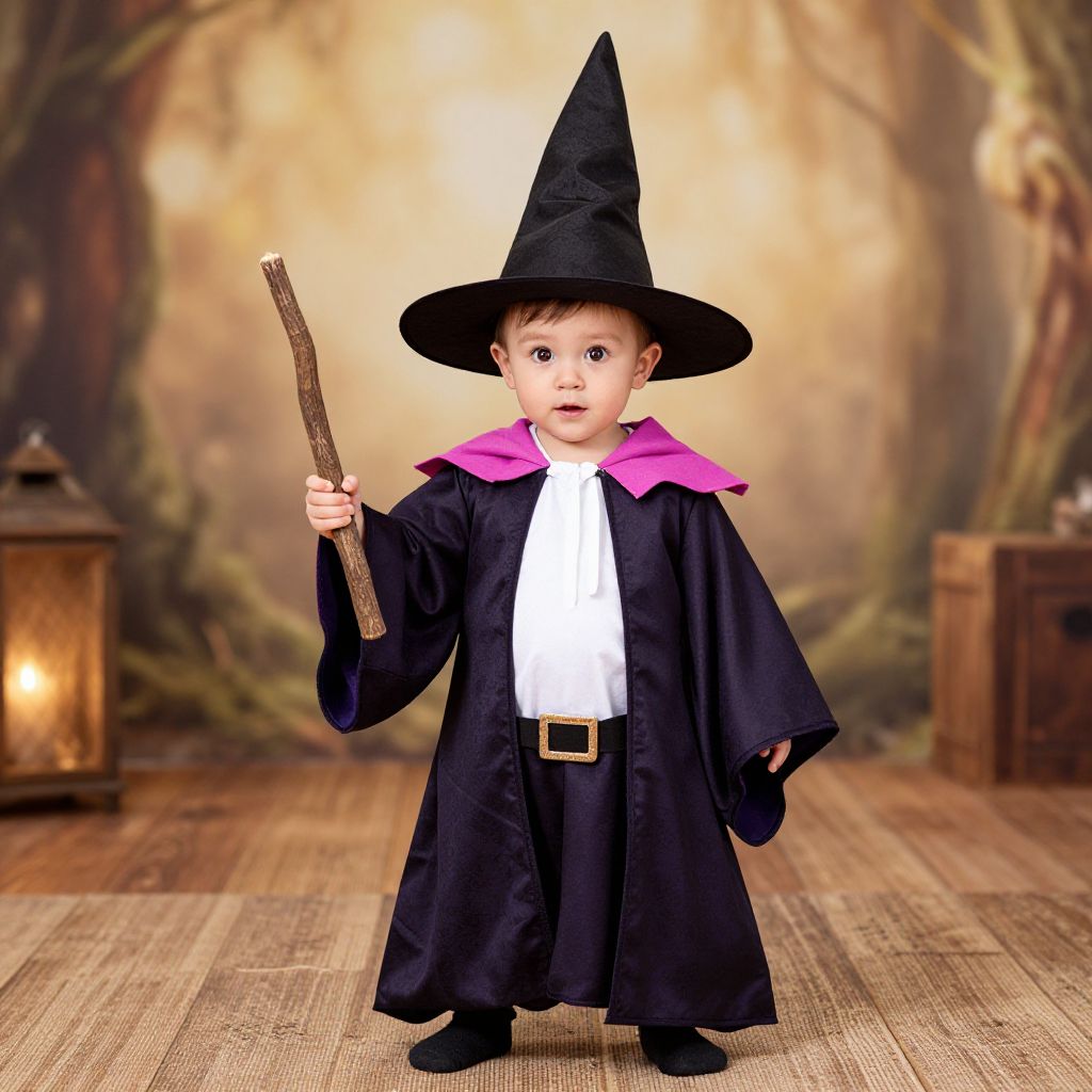 "Wizard Infant Costume, boy dressed in a wizard costume holding a stick"