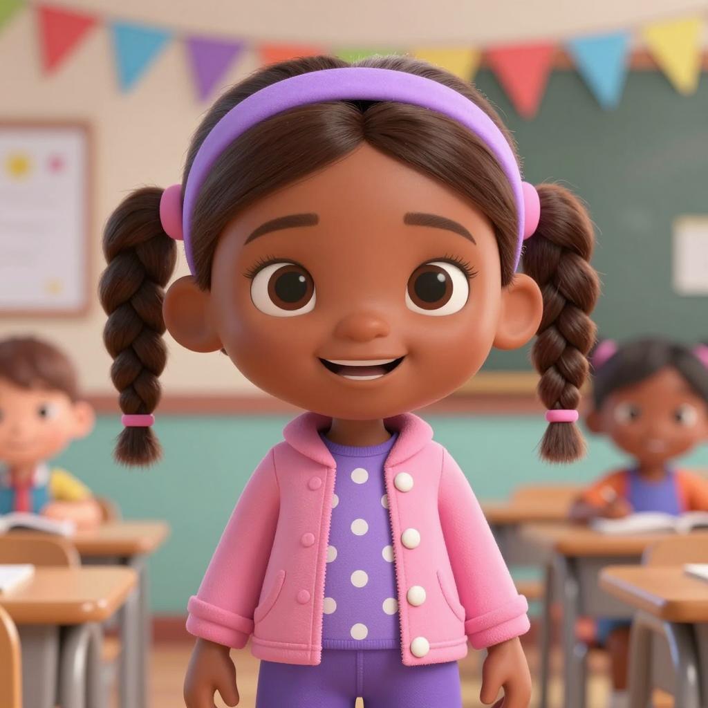 3D-rendered digital animation of an African-American girl with medium brown skin and brown braided pigtails. She is wearing a pink jacket with white buttons, a purple polka dot shirt, and a purple hairband. The girl stands smiling in a classroom with blurred background featuring colorful decorations and other children at desks. The image captures a child-friendly, cheerful atmosphere with soft lighting and warm tones.