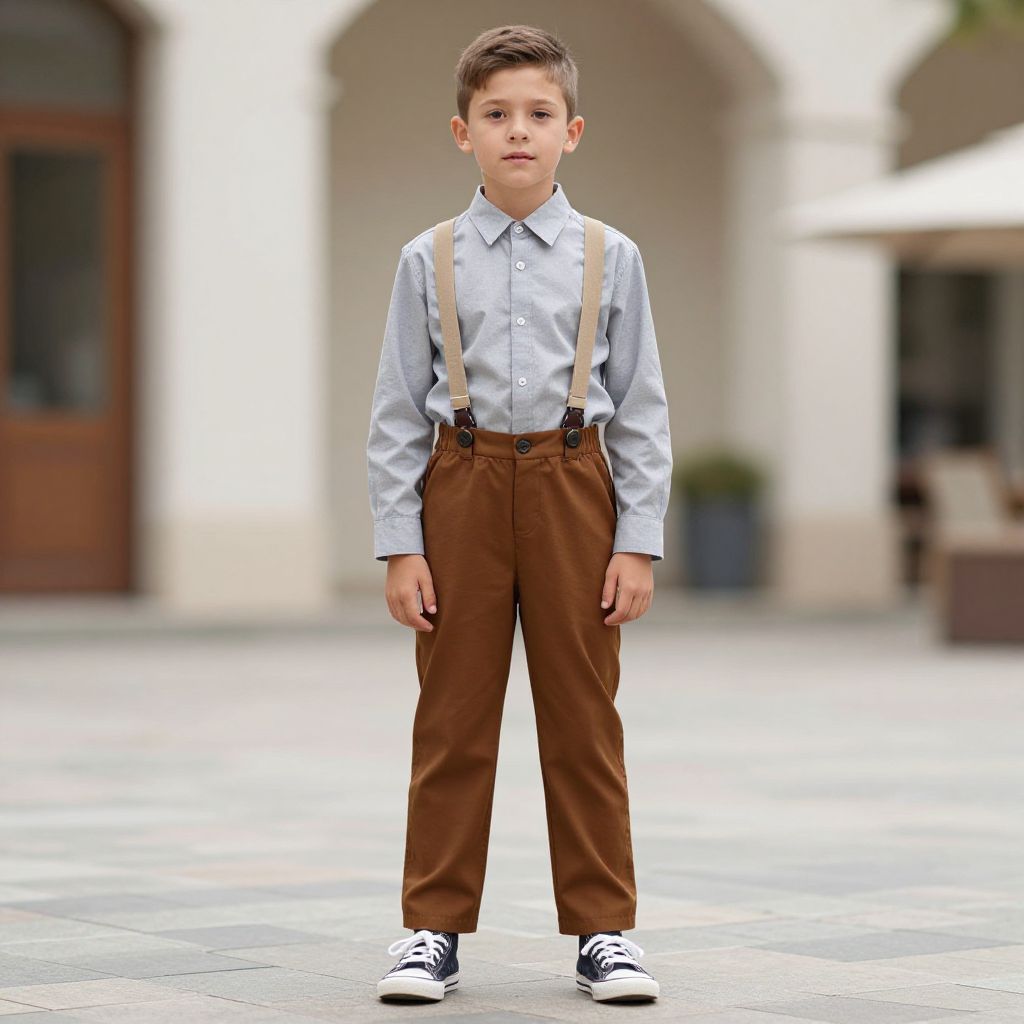 Carters costume, 1boy, solo, male focus, outdoors, pants, suspenders, full body, shoes, brown pants, blurry, blurry background, standing, looking at viewer, sneakers, long sleeves, short hair, shirt, building, day