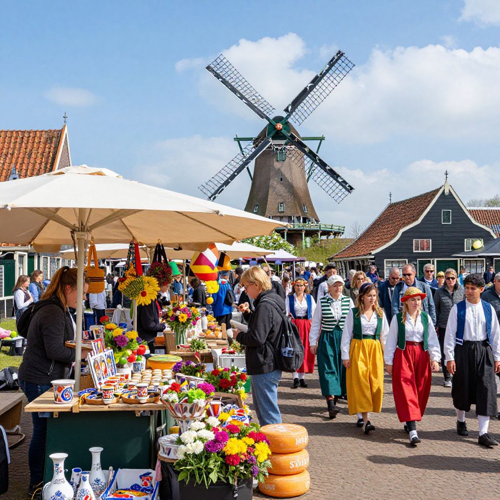 Holand traditional market bustling with colorful stalls, fresh flowers, cheese wheels, and local crafts, lively crowd in traditional Dutch costumes, windmills in background, bright sunny day, photorealistic textures and rich colors capturing festive vibe