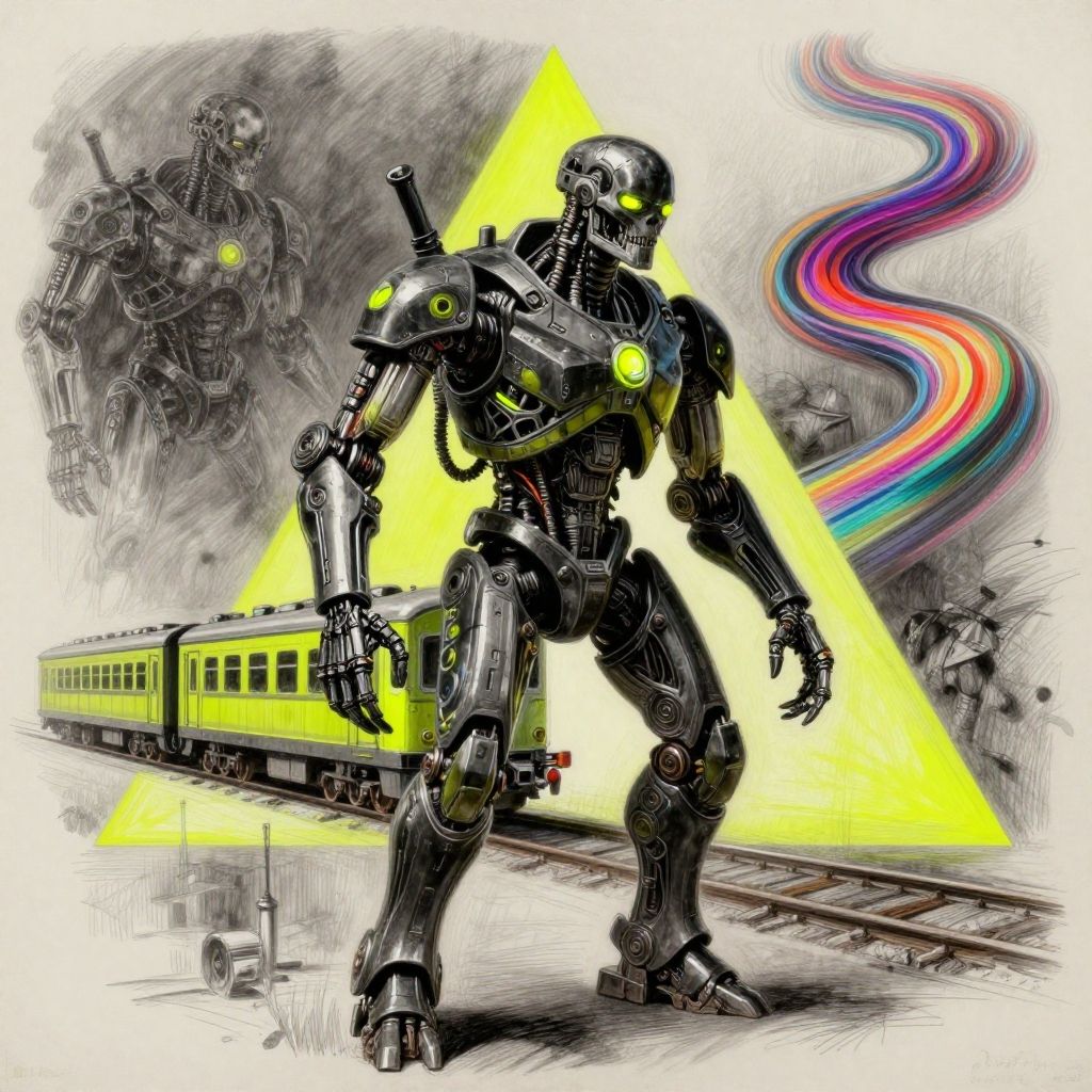 Digital artwork: Cybernetic robot with glowing yellow accents stands on train tracks, carrying a green train, beside a yellow triangle and colorful rainbow swirls