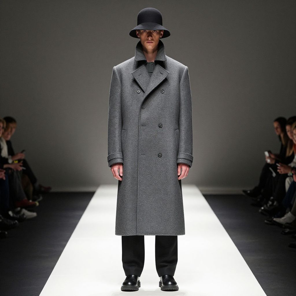 Photograph of a male model standing on a white-lit runway. He wears a long, grey, double-breasted overcoat with black buttons, black collared shirt, and black trousers. He also sports a black wide-brimmed hat that partially covers his face. The background is a dark, minimalist setting with an audience blurred in the shadows on both sides. The runway's bright white light contrasts sharply with the model's grey coat and black accessories, highlighting the coat's textured fabric. The overall style is modern and minimalist, focusing on the overcoat's simplicity and elegance.