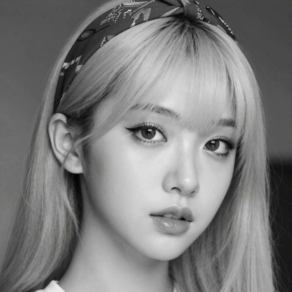 This is a monochrome digital portrait of a young woman with light blonde hair, styled with straight bangs and a dark headband featuring a subtle pattern. She has large, expressive eyes with heavy black eyeliner, and her gaze is directed slightly to the right. The image has a high-contrast, almost ethereal quality, with soft shadows and highlights enhancing her delicate features. The background is a blurred gradient, keeping the focus on her face.