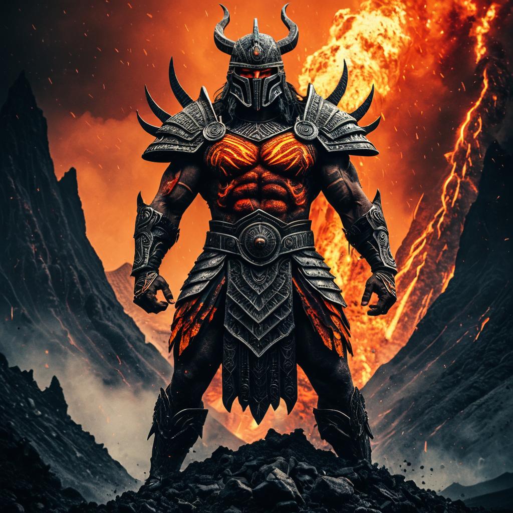 A hyper-realistic depiction of an ancient warrior standing heroically amidst a volcanic eruption. The warrior is clad in intricate, dark armor accented with fiery orange tones resembling molten lava. The background features erupting lava and rugged volcanic terrain, emphasizing the volcanic theme and dramatic atmosphere.