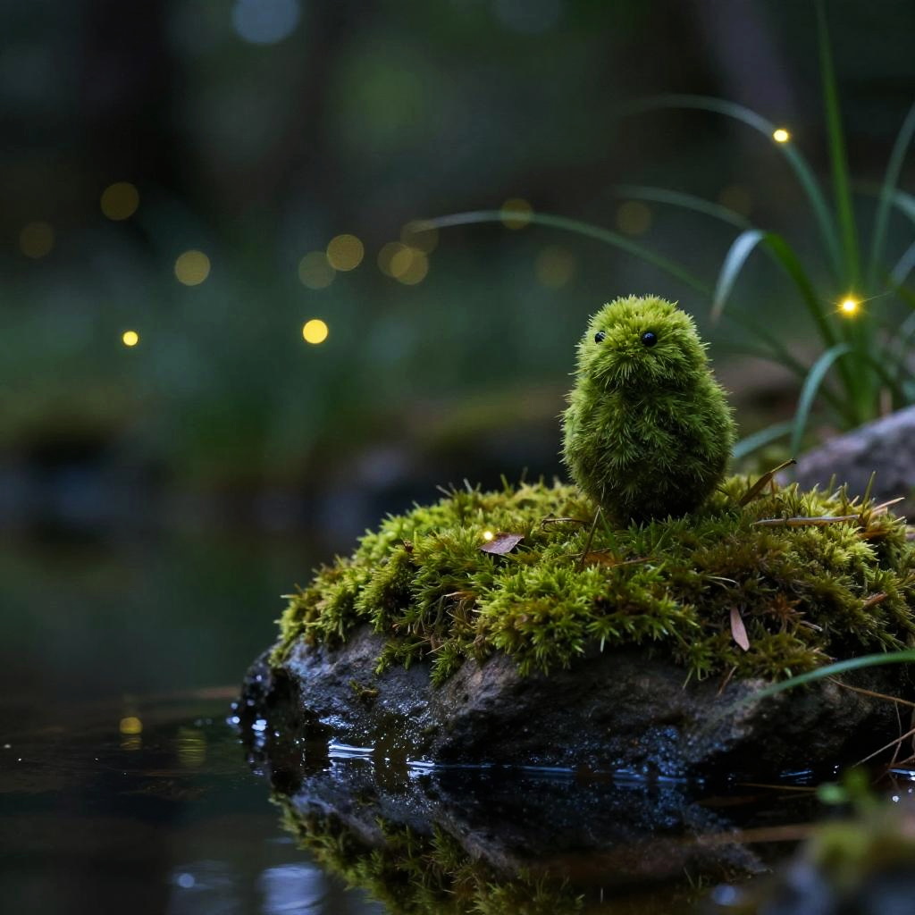 No humans, plant, water, outdoors, solo, nature, scenery, blurry, moss, standing, reflection, grass, creature, rock, looking at viewer, black eyes, fireflies, depth of field, leaf, green theme, pond, forest, glowing, vines, night