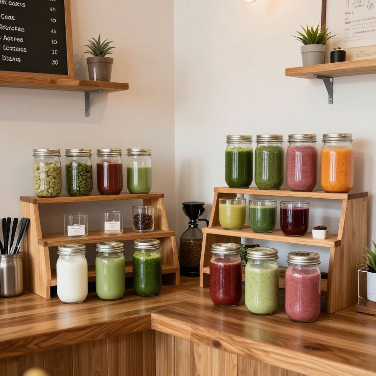 Drinks prompt: A cozy café corner with artisanal drink stations, handmade smoothies in glass jars, natural ingredients, and warm wooden textures, highlighting health, sustainability, and community vibes.