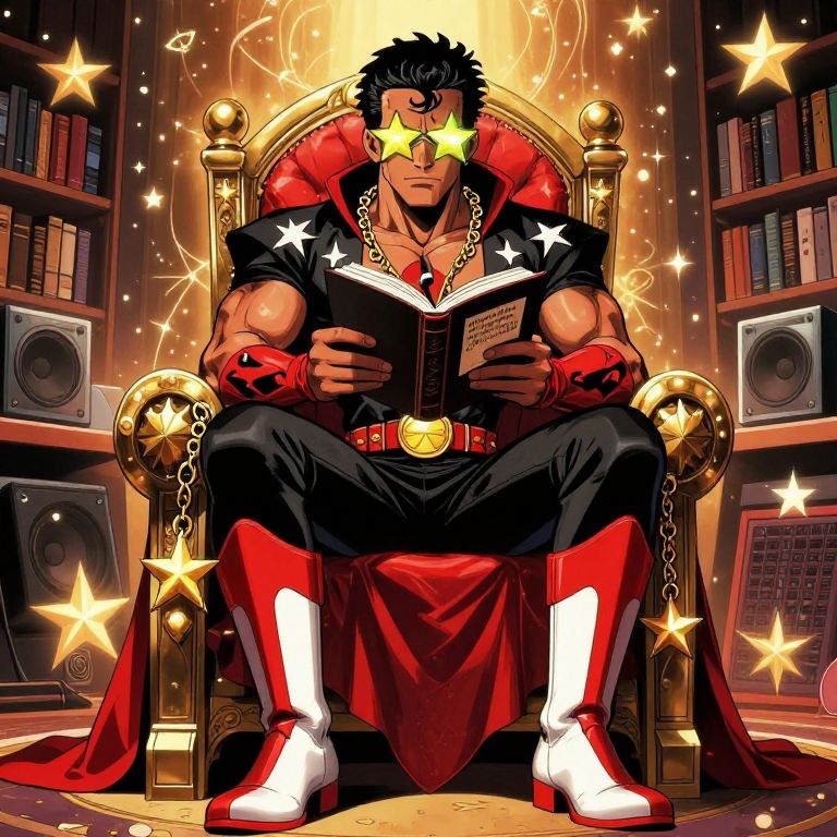 In this captivating manga-style illustration, a muscular superhero, reminiscent of Bootsy Collins, sits regally on a throne, exuding an aura of power and wisdom. His attire is a striking blend of black and red, adorned with intricate star-shaped designs that add a touch of mystique. The superhero's boots, a bold combination of red and white, are complemented by star-shaped gold chains that drape around his neck, symbolizing his connection to the cosmic. His star-shaped glasses reflect a sense of mystery and intensity. In his hands, he holds a book, engrossed in reading or writing lyrics to a song, suggesting a dual role as a musician and a hero. The surrounding environment is a magical recording studio or library, filled with stars and celestial symbols, enhancing the fantastical atmosphere. The scene is bathed in warm, starlit hues, creating a sense of warmth and wonder. The overall composition is dynamic, with the superhero as the central figure, surrounded by elements that emphasize his importance and the mystical nature of his world.