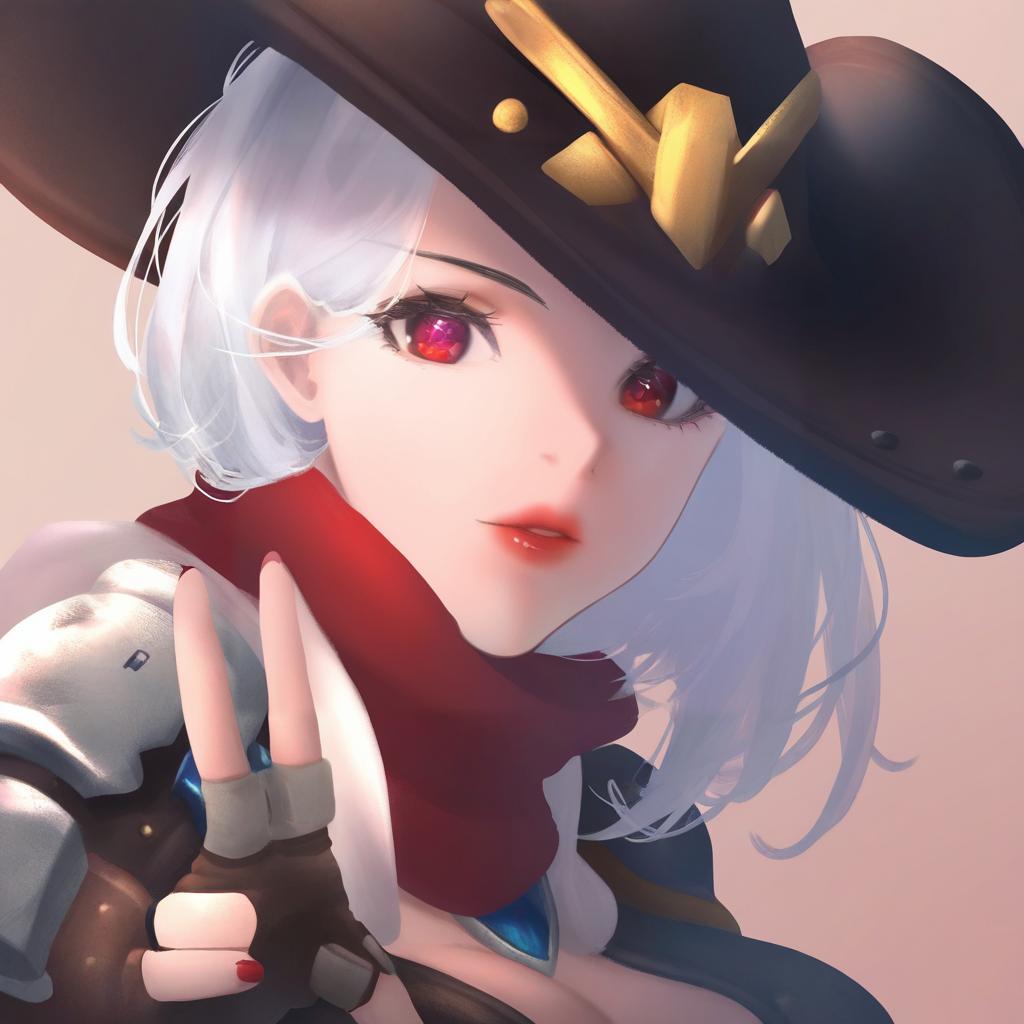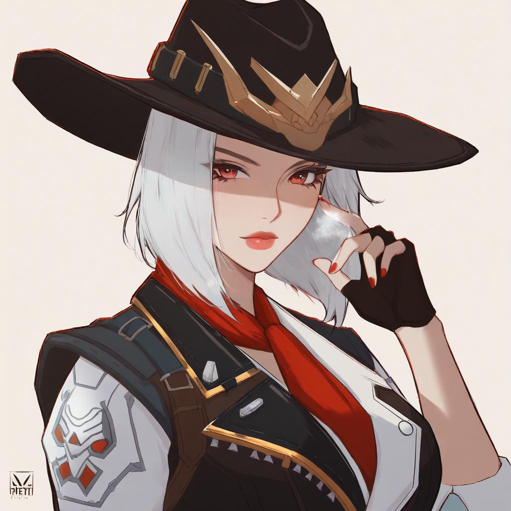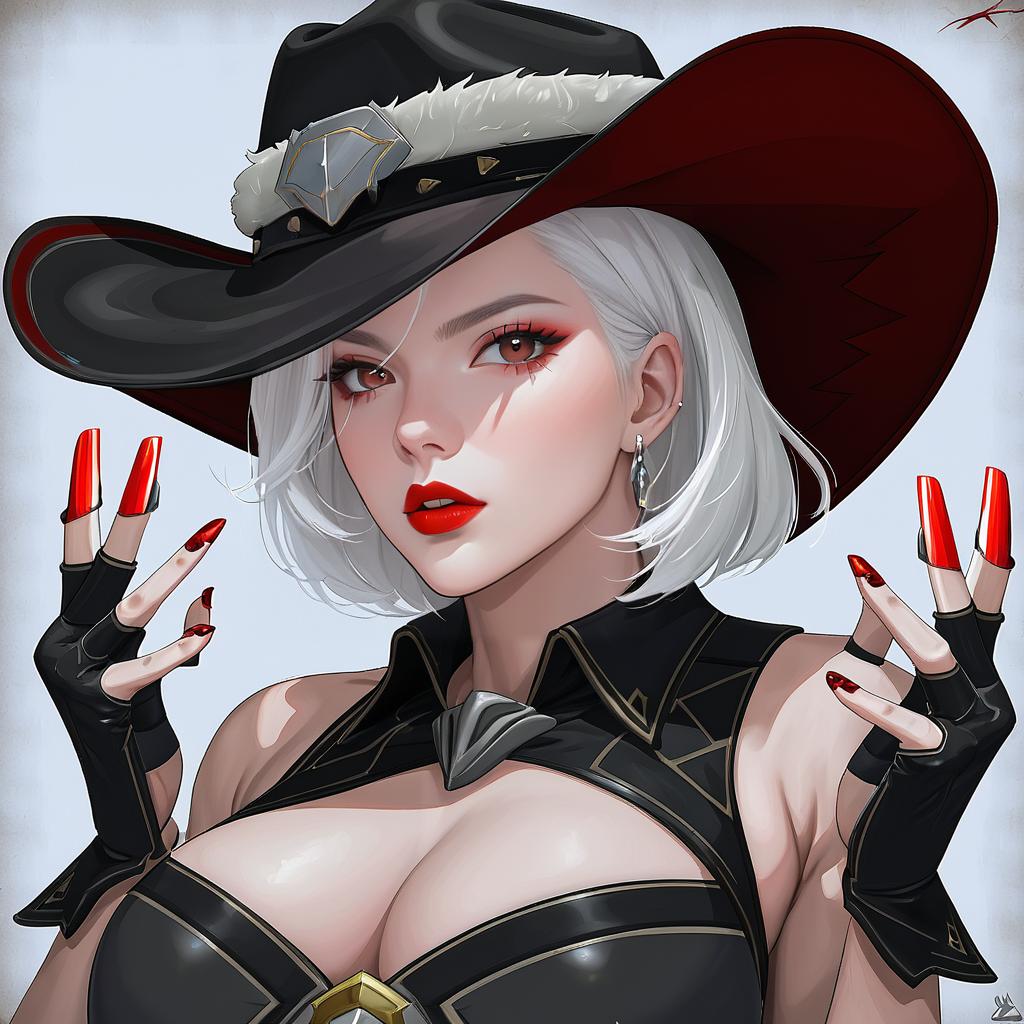 Ashe (overwatch), overwatch, 1girl, mole above mouth, red lips, lips, red eyes, white hair, short hair, medium hair, large breasts, medium breasts, cowboy hat, fingerless gloves, nail polish, lipstick, by artist kashikaze, anime