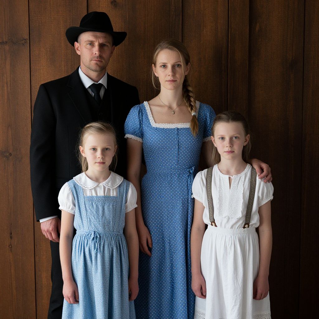 In this image, a strict Amish family stands together, their expressions serious and unsmiling as they look directly at the camera. The family consists of a man, a woman, and two young girls. The man, dressed in a black suit and hat, stands behind the woman, who wears a blue dress with white polka dots. The two girls, one in a blue dress and the other in a white dress with suspenders, stand in front of the woman. The family is positioned against a wooden background, which adds a rustic and traditional feel to the scene. The overall composition is balanced, with the family members evenly spaced and aligned, creating a sense of unity and harmony. The colors in the image are muted and earthy, with the blues and whites of the family's clothing contrasting against the dark wood. The textures of the clothing and the wooden background add depth and richness to the image, enhancing its visual appeal.