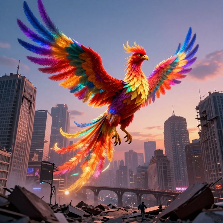 Digital art: Vibrant, rainbow-feathered phoenix with fiery eyes soaring over a destroyed cityscape with skyscrapers, sunset sky, and debris