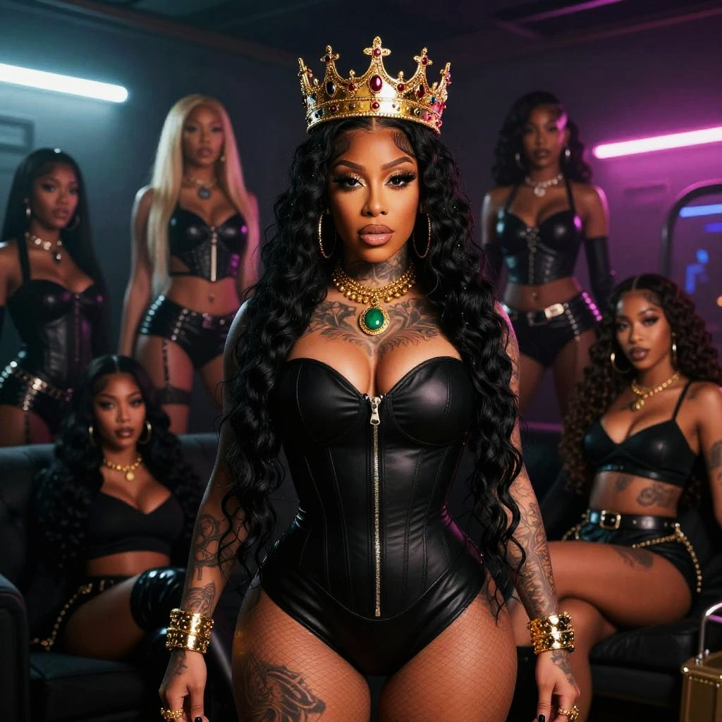 Realistic photo.Digital art featuring Nicki Minaj wearing a crown in a traphouse, surrounded by women in various poses and edgy outfits. Dark, moody atmosphere with smoke and neon lights, confident expression, surreal vibe, adding a touch of royalty. realistic photo