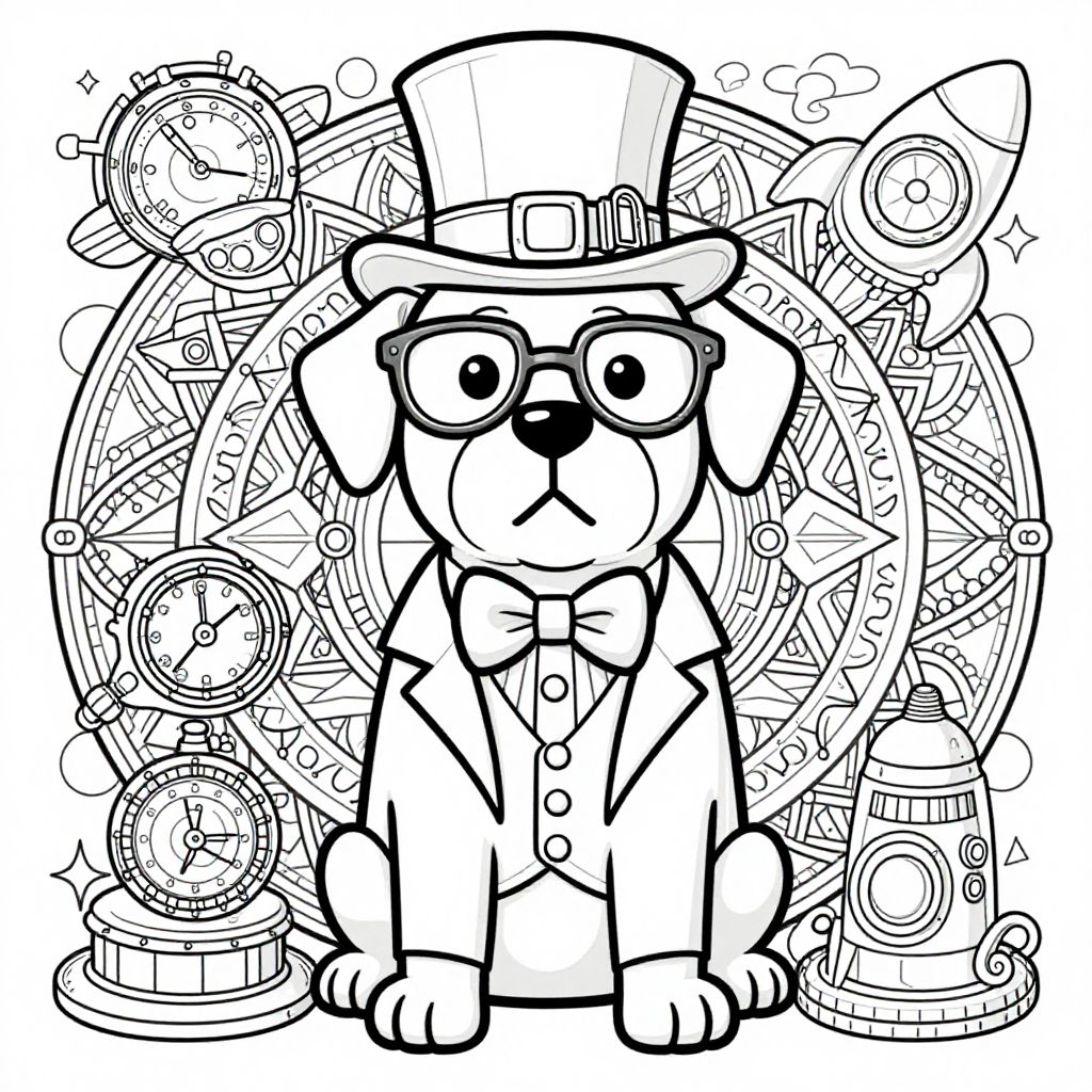 The image is a highly detailed, colorless coloring page for an adult coloring book, featuring an anthropomorphic dog in a steampunk style. The dog is adorned with a top hat, glasses, a bow tie, and a suit, all drawn with thick, bold black lines. The background is a mandala with intricate patterns and steam-powered machinery, including a clock and a rocket, all filled with white. The overall composition is symmetrical, with the dog centrally positioned and the mandala elements arranged around it. The image is extreme detailed, with no shading, grayscales, or black shading, and no shadows, maintaining a clean and crisp line art style.