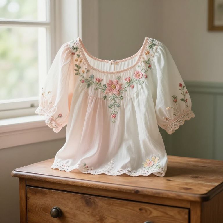 AI generated downblouse with intricate floral detailing in pastel colors, placed on a vintage wooden dresser with soft natural light, evoking a dreamy, serene cottage-style interior and digital art influence.