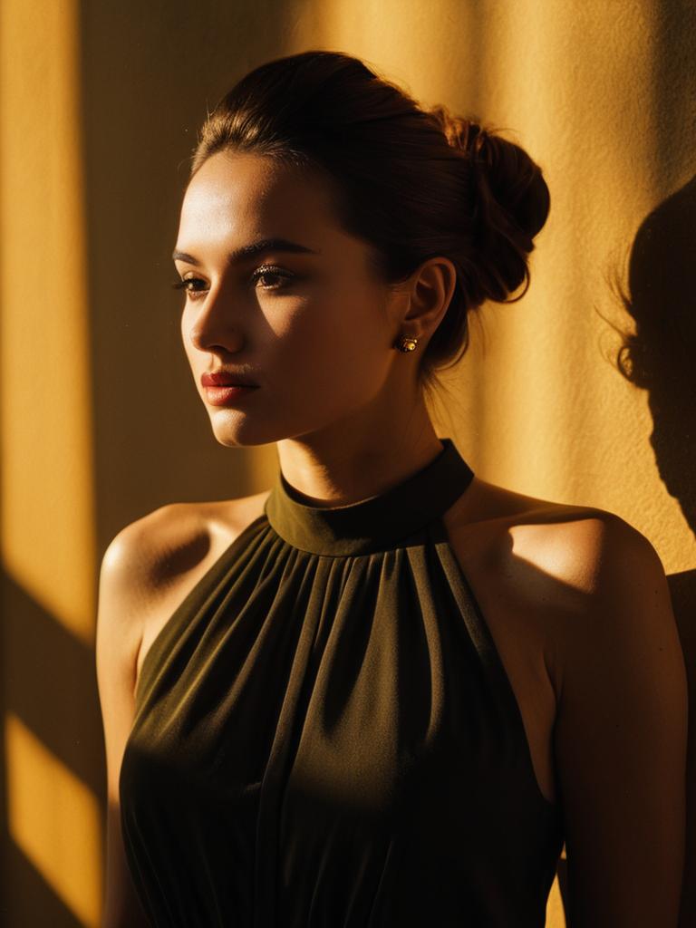 Portrait of a woman wearing an olive green halterneck playsuit with a twist detail at the front. She has her hair styled in a casual updo, accessorized with simple stud earrings. The image features warm lighting casting shadows on a mustard-yellow wall background, creating a contemplative mood.