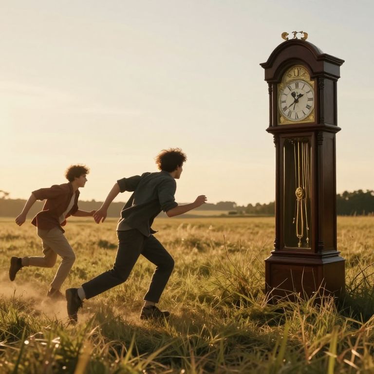 In a sun-drenched field where time stands both still and in perpetual motion, figures race toward an enigmatic grandfather clock, their breaths heavy with the urgency of escape and the weight of unspoken fears, as the golden hour whispers secrets of transience and the relentless pursuit of moments lost.