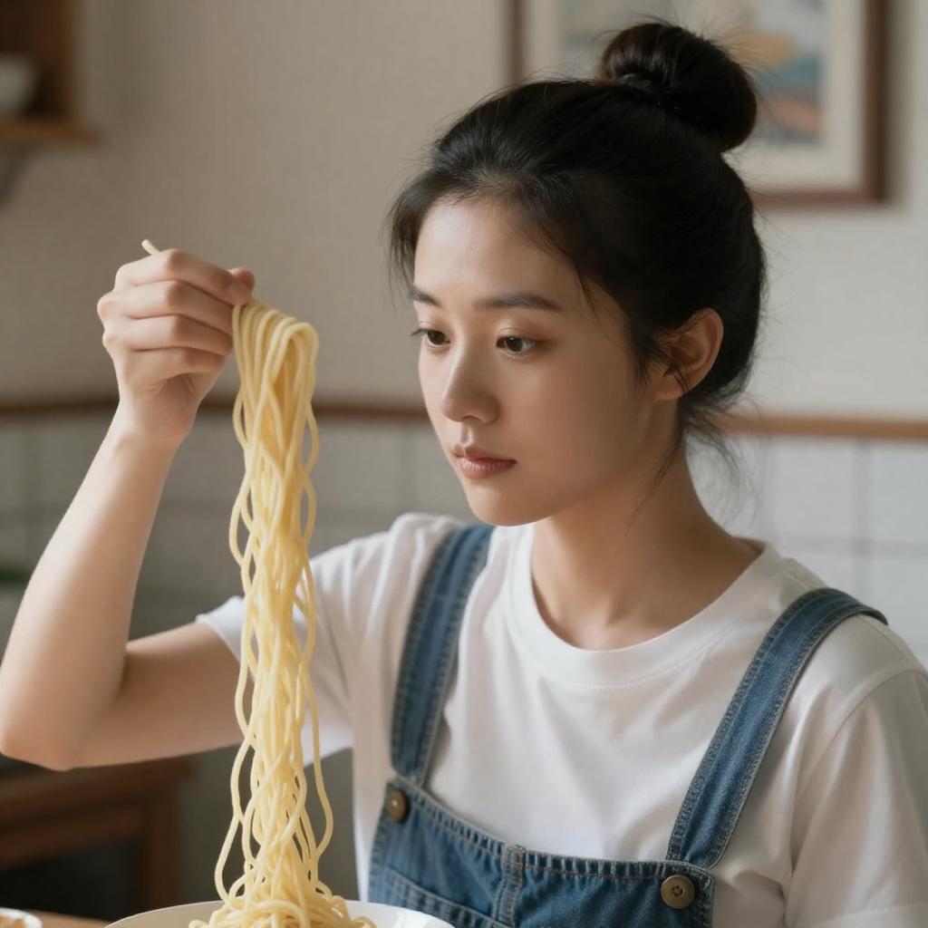 Asian woman with dark hair in a bun, wearing a white shirt and blue suspenders, holds a tangled yellow noodle. She looks down at the noodle with a focused expression. Background has tiled walls and a framed picture. Indoor setting.