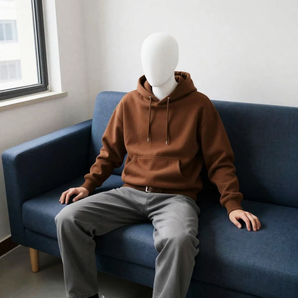 A person with a white, featureless head sits on a dark blue couch in a minimalistic room. They wear a brown hoodie, gray pants, and a brown belt. Their hands rest on the couch. A window on the left shows an exterior building. A white cylindrical object is on the floor to the left.